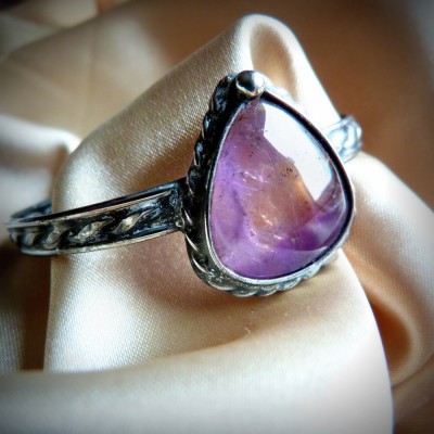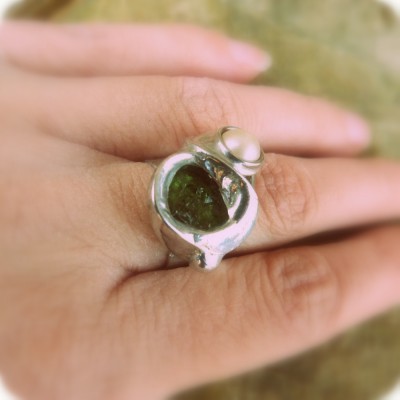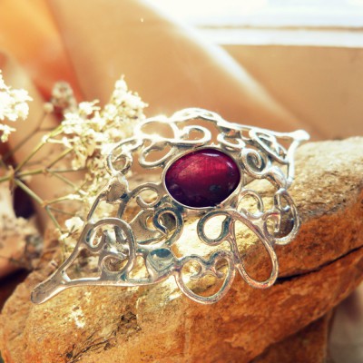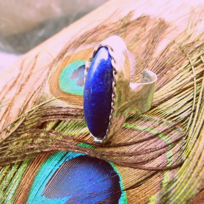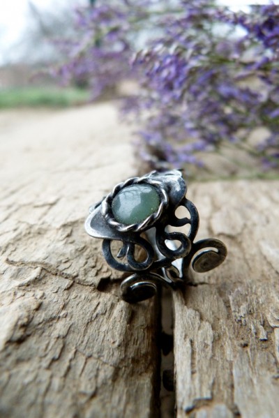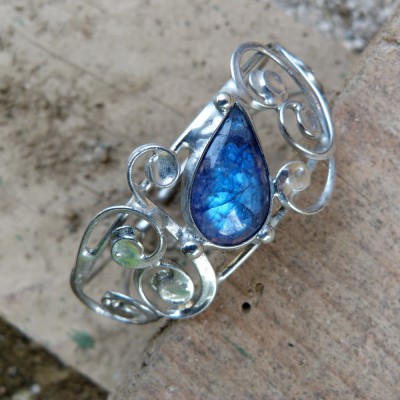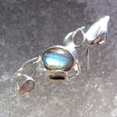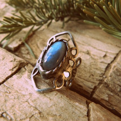 Mega prstienok tvorený spletenými cínovanými lístkami s krásnym kabošonom labradoritu s nádhernými belasými odleskmi. Veľkosť kameňa 1,5 x 1,1 cm, dĺžka prsteňa 6,2 cm; priemer obrúčky 1,8 cm