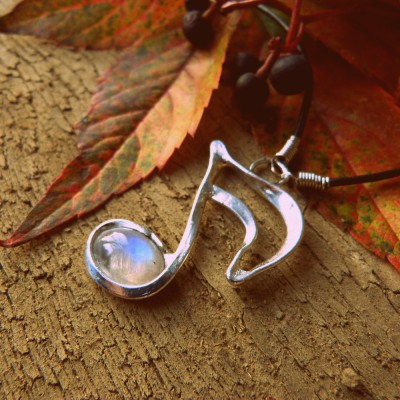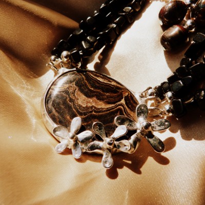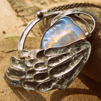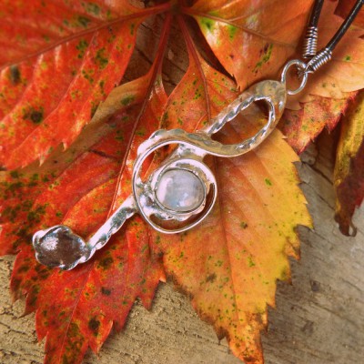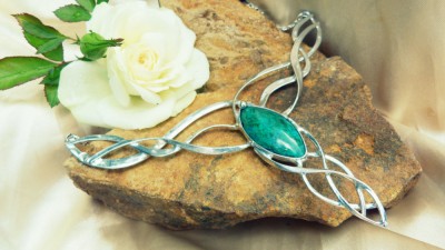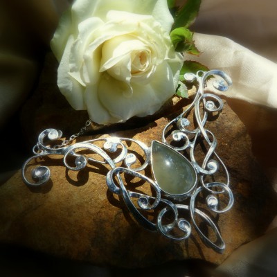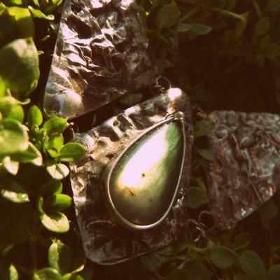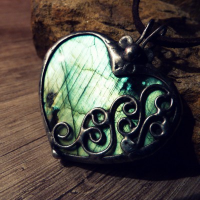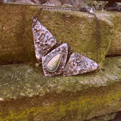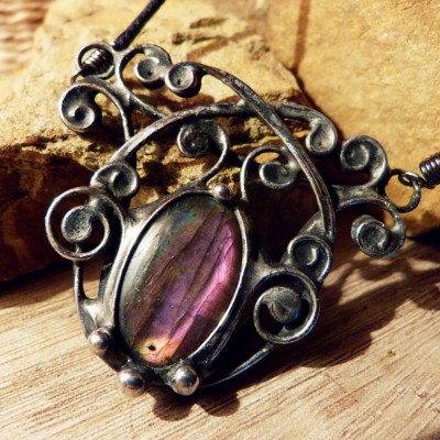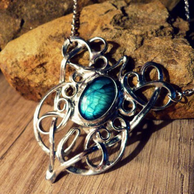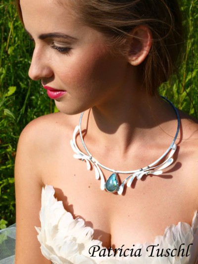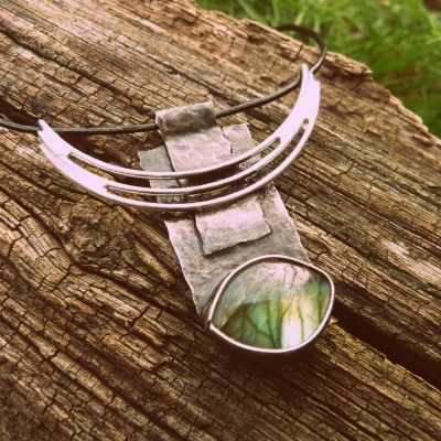 Náhrdelník z cínu, ktorého štruktúra je zvýraznená patinou s krásnym kabošonom labradoritu v tvare slzy. Náhrdelník je zavesený na čiernej retiazke so zapínaním na karabínku. Vertikálne v najširšom mieste 10 cm, stredný dielik dĺžka 5 cm, šírka 3,5 cm; veľkosť kameňa 2,5 x 1,3 cm; dĺžka retiazky 36 cm