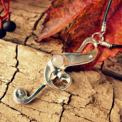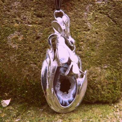 Achátová drúza s drobnými kryštálmi v čierno bielej farbe symbolizuje topiaci sa ľad, nad ktorým už rastú prvé jarné snežienky. Prívesok je možné zavesiť na retiazku striebornej farby alebo čiernu kožu. Veľkosť 6,5 cm x 3,3 cm; drúza 2,8 cm x 1,5 cm