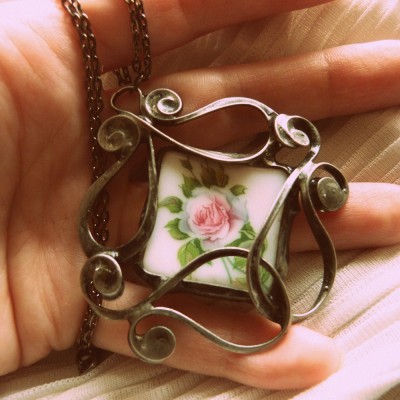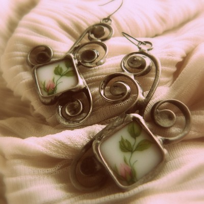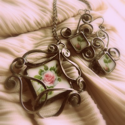 Romantická sada šperkov s krásnymi maľovanými porcelánovými kabošónmi s motívom ruží. Antický efekt bol dosiahnutý použitím patiny. Veľkosť náhrdelníka 6 x 6 cm, dĺžka retiazky 64 cm; veľkosť náušníc 5,5 x 2,2 cm