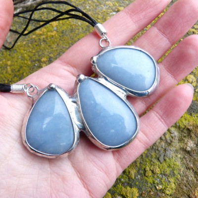 Masívnejší náhrdelník z hladeného angelitu krásnej svetlomodrej farby. Zavesený na čiernej voskovanej šnúrke so zapínaním na karbínku. Veľkosť 7,5 x 4 cm, dĺžka šnúrky 46 cm.
