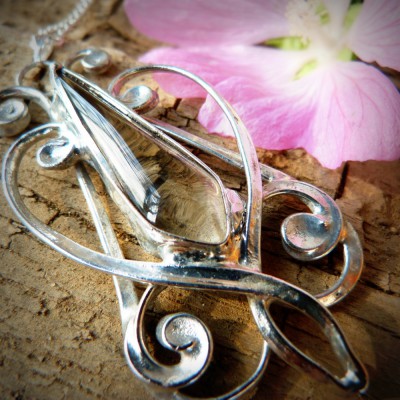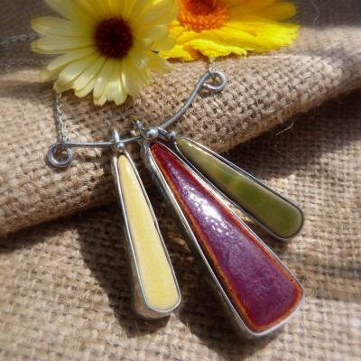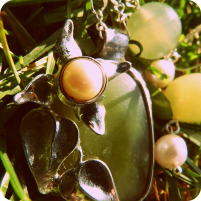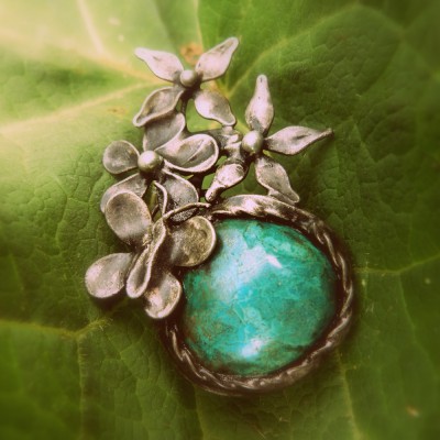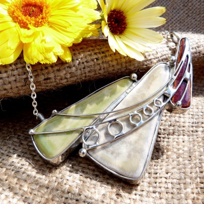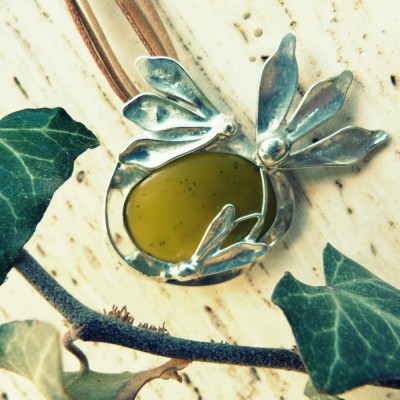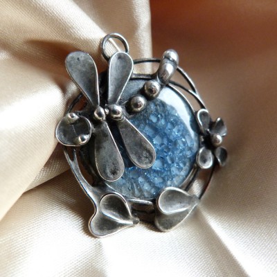 Cínovaný príesok s keramickým kabošónom s praskanou glazúrou. Prívesok je ozdobený cínovanými lístkami, kvietočkom a jeho dominantou je vážka. Retiazka alebo šnúrka podľa vášho výberu.