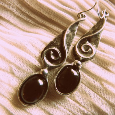 Krásny čierny diopsid s odleskom v tvare hviezdičky ako náušnice so špirálovým vzorom zvýrazneným čiernou patinou. Dĺžka náušnice 5 cm, veľkosť kameňa 1,2 x 0,8 cm.