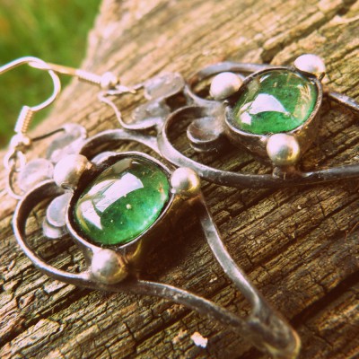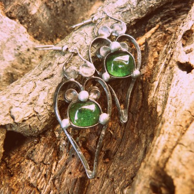 Cínované náušniceso zeleným očkom. Použila som krásne zelené tavené sklo, ktoré zvýraznila čierna patina. Afroháčiky sú priemyselnej výroby. Veľkosť náušnice 5,5 x 2,5 cm, veľkosť sklíčka 1,2 x 1 cm.