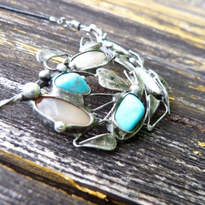 Náhrdelník s tromlovaným mesačným kameňom - adulár a farbeným tyrkysovým magnezitom. Zdobeným cínovými lístkami, zavesený na čiernej voskovanej šnúrke s predlžovacou retiazkou.