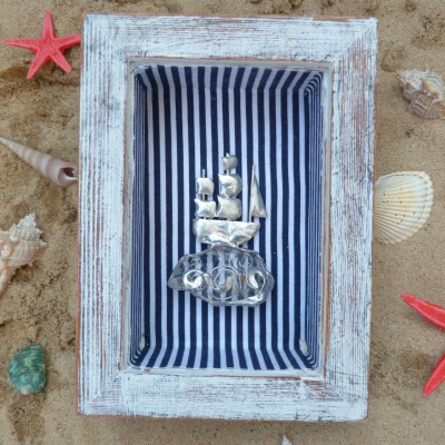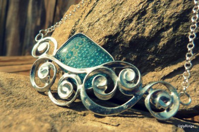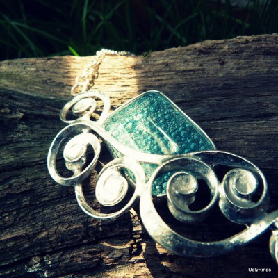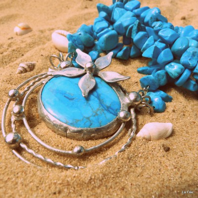 ... ktorú som vložila do prívesku vytvoreného z tyrkenitu vajíčkovitého tvaru ozdobeného malou plachetnicou. Tyrkysová farba symbolizuje more a nekonečnú letnú modrú oblohu. Lodičku z drobnými okienkami som zvýraznila čiernou patinou. Prívesok je zavesený na bižutérnej retiazke čiernej farby so zapínaním na karabínku. Prívesok meraný v najširších miestach 4,9 x 3,6 cm; kameň 4,2 x 2,2 cm; retiazka 56 cm