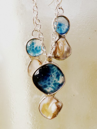 Sada cínovaných šperkov náušnice + prívesok. Spojila som zaujímavé tavené sklo, ktoré mi pripomína more s perleťou. Prívesok 5 x 2,5 cm; sklo 2,5 x 2,5 cm; perleť 1,8 x 2 cm; retiazka 48 cm; náušnice cca 3,5 x 1,5 cm.