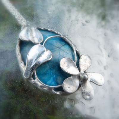 Prívesok s farbeným kremeňom zdobený cínovanou kvetinkou. Rozmery 5,7 x 3 cm, retiazka striebornej farby 45 cm.