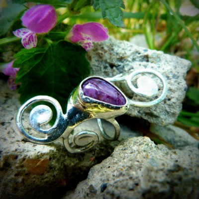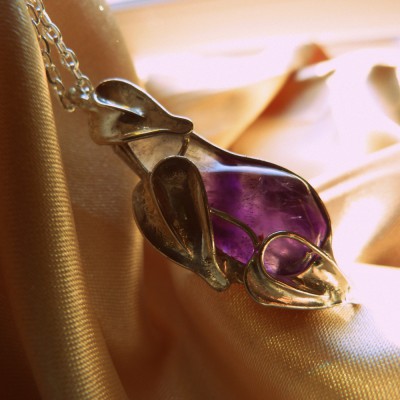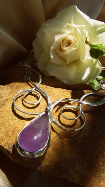Kvetinový náhrdelník s cínovými lístkami a malými kabošonmi ametystu. Krásna fialová farba ametystu pekne kontrastuje so strieborným cínom. Náhrdelník je zavesený na retiazke striebornej farby so zapínaním na karabínku. Horizontálne meria náhrdelník 12 cm, vertikálne 5,5 cm, veľkosť kamienkov 1 x 0,8 cm; 0,9 cm; 0,7 cm; dĺžka retiazky 42 cm.