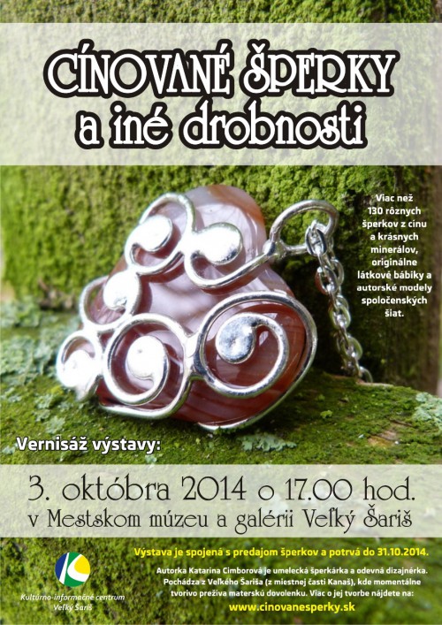 Milí priatelia cínovných šperkov a minerálov, s potešením vás pozývam výstavu, ktorá vás prevedie troma rokmi mojej tvorby. V Múzeu a galérii mesta Veľký Šariš si budete môcť pozrieť cínované šperky z mojej dielne ako aj originálne látkové bábiky a spoločenské šaty. Výstava potrvá od 3. októbra do 31. októbra 2014. Pre viac info volajte 0948 903 321, 0911 446 206 .