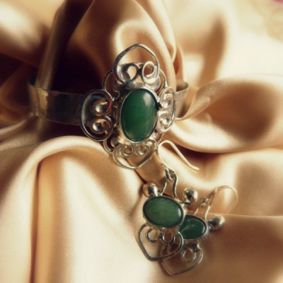 Sada cínovaných šperkov so svtlozeleným avanturínom. V sade sú náramok a náušnice. Náušnice majú postriebrené náušnicové háčiky. Veľkosť: náramok - filigránový motív 4,5 x 4 cm; kameň 1,8 x 1,3 cm; obruč náramku šírka 1 cm, obvod náramku 16,7 cm (náramok je neuzatvorený a teda prispôsobiteľný). Náušnice - dlžka vrátane háčika 4 cm, šírka v najširšom mieste 2 cm, veľkosť kameňa 1,3 x 0,9 cm Zložene: Cu, Sn99,3 Cu0,7-E